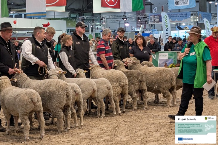Auf der Landwirtschaftsausstellung agra 2026 vom 09.-12. April 2026 in Leipzig war das EIP-Agri-Projekt „ZuKuMe – Zucht auf Kurzschwänzigkeit beim Merinofleischschaf“ am Stand des Sächsischen Schaf- und Ziegenzuchtverbandes e.V. vertreten und konnte einem breiten Fachpublikum vorgestellt werden. Die Messe erwies sich als voller Erfolg: Zahlreiche Züchterinnen und Züchter, Tierhalterinnen und Tierhalter sowie weitere Fachbesucher nutzten die Gelegenheit, sich über die Zielstellung, den aktuellen Projektansatz und die praktische Relevanz des Vorhabens zu informieren. Im Mittelpunkt der Gespräche stand die Entwicklung einer praxistauglichen züchterischen Lösung zur Verkürzung der Schwanzlänge beim Merinofleischschaf. Dabei geht es insbesondere um die Integration entsprechender Merkmale in die Leistungsprüfung, die genetische Analyse des Kandidatengens HOXB13 sowie die Ableitung praxisorientierter Empfehlungen für Zucht und Haltung. Das Projekt wird seit Januar 2025 bearbeitet und in enger Zusammenarbeit von ZAFT, dem Sächsischen Schaf- und Ziegenzuchtverband sowie weiteren Praxispartnern umgesetzt.
